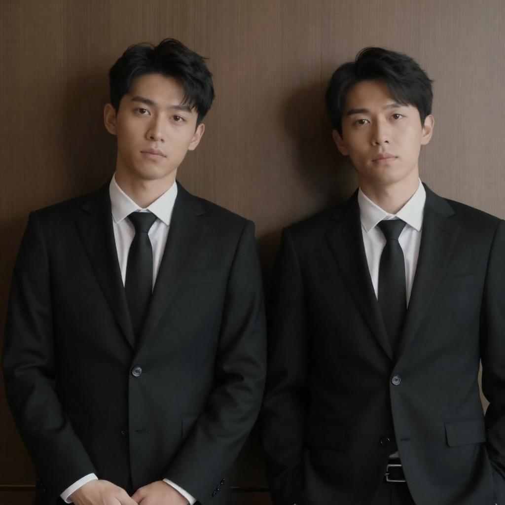 Two Asian Men in Black Suits Standing Against Wooden Wall