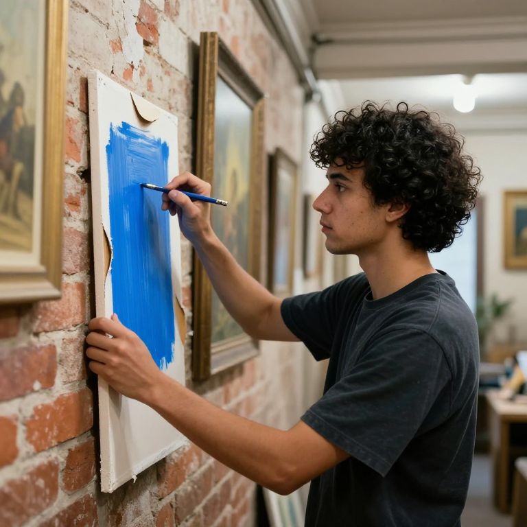 A narrow hallway with exposed brick walls and old paintings hanging on the side shows a young artist with curly black hair and a thoughtful face, carefully adding a bold blue stroke to a torn canvas, highlighting the artistic edge through tension and precision in a realistic, documentary-style shot.