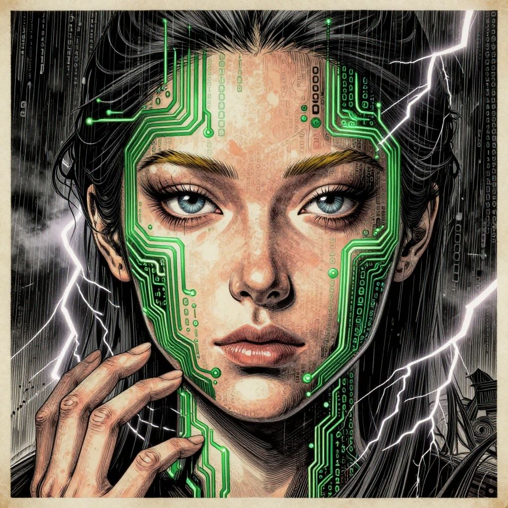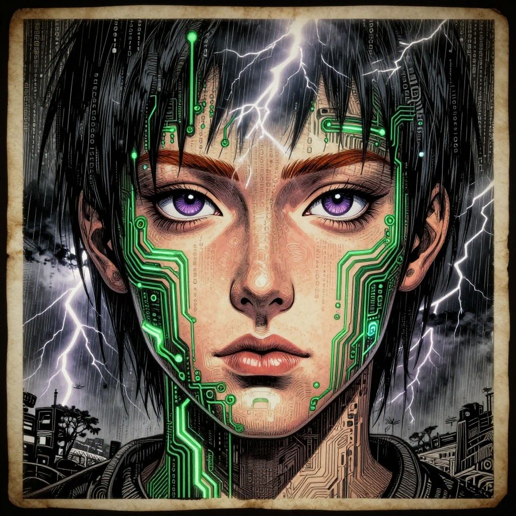 Photograph (Ink illustration on parchment):1.5 of ((eye with ((eyebrow-sharpe sleek natural, eyebrowcolor ginger)))) {male|female}, (face:Circular Face, Mediterranean Eyes, [eye color violet], Nose with an Arched Bridge Shape, thin lips, prominent cheeks, square chin), In a world where the digital and the organic have intertwined, a face emerges from the matrix of reality. The eyes, mouth, nose, and face are visible, but the rest of the body is obscured by the dense, swirling patterns of binary code that make up the background. The features of the face are a canvas of flesh interwoven with vibrant green circuits, pulsing with the rhythm of binary codes, MATRIX Style, dramatic confrontation in a thunderstorm, pivotal confrontation between characters occurs in the midst of a dramatic thunderstorm, with lightning flashing and rain pouring down ambient light, cinematic aesthetic, sharp focus, highly detailed, very fine detail, perfect, dynamic composition, by Satoshi Kon and Mike Mignola, (black, alluring, masterful:1.4), poster art, bold lines, hyper detailed, expressive, award winning, (landscape:1.4), (intricate details, masterpiece, best quality:1.4), 50mm . cinematic 4k epic detailed 4k epic detailed photograph shot on kodak detailed cinematic hbo dark moody, 35mm photo, grainy, vignette, vintage, Kodachrome, Lomography, stained, found footage, key lighting, looking at viewer, dynamic pose, wide angle view, dramatic, (masterpiece, best quality, high quality), hyperdetailed, highres, intricate detail, HDR, 8k, detailed background, perfect hands, realistic eyes, detailed skin texture, subsurface scattering, realistic, temple, dark, photorealistic, (Ink illustration on parchment):1.5 of ((eye with ((eyebrow-sharpe sleek natural, artistic, positive, calm, beautiful, atmosphere, glossy, shiny, rich deep colors, striking, awesome, full clear, nice, great complimentary symmetry, intricate, epic, cool, fascinating