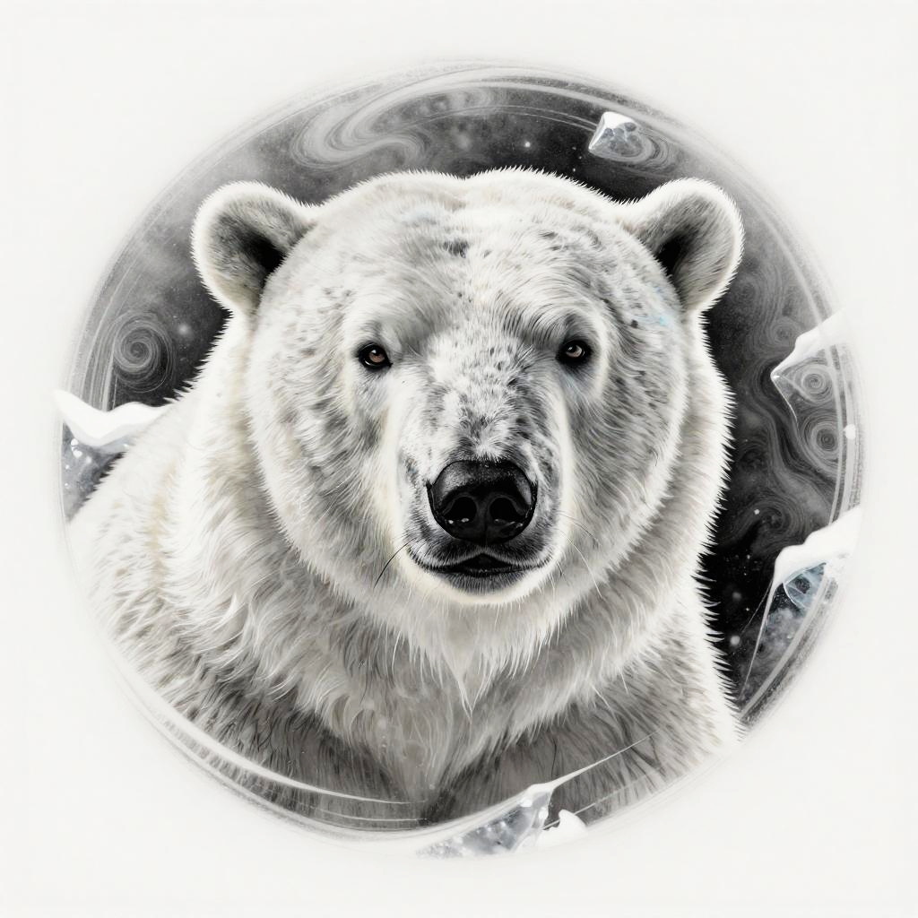 Realistic polar bear tattoo design with the bear's head emerging from swirling snow and ice patterns, highly detailed fur strands and expressive eyes, in black and white with subtle blue highlights, artistic and lifelike execution.