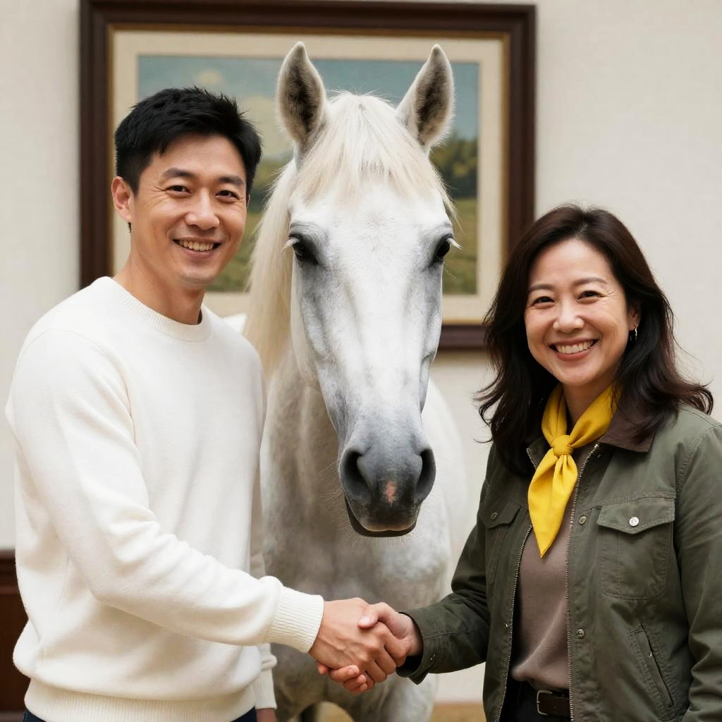 Photograph of two people shaking hands in front of a framed picture of a white horse. Man on left wears white sweater, woman on right wears green jacket with yellow scarf. Both smile. Horse in center, white with gray spots. Indoor setting.