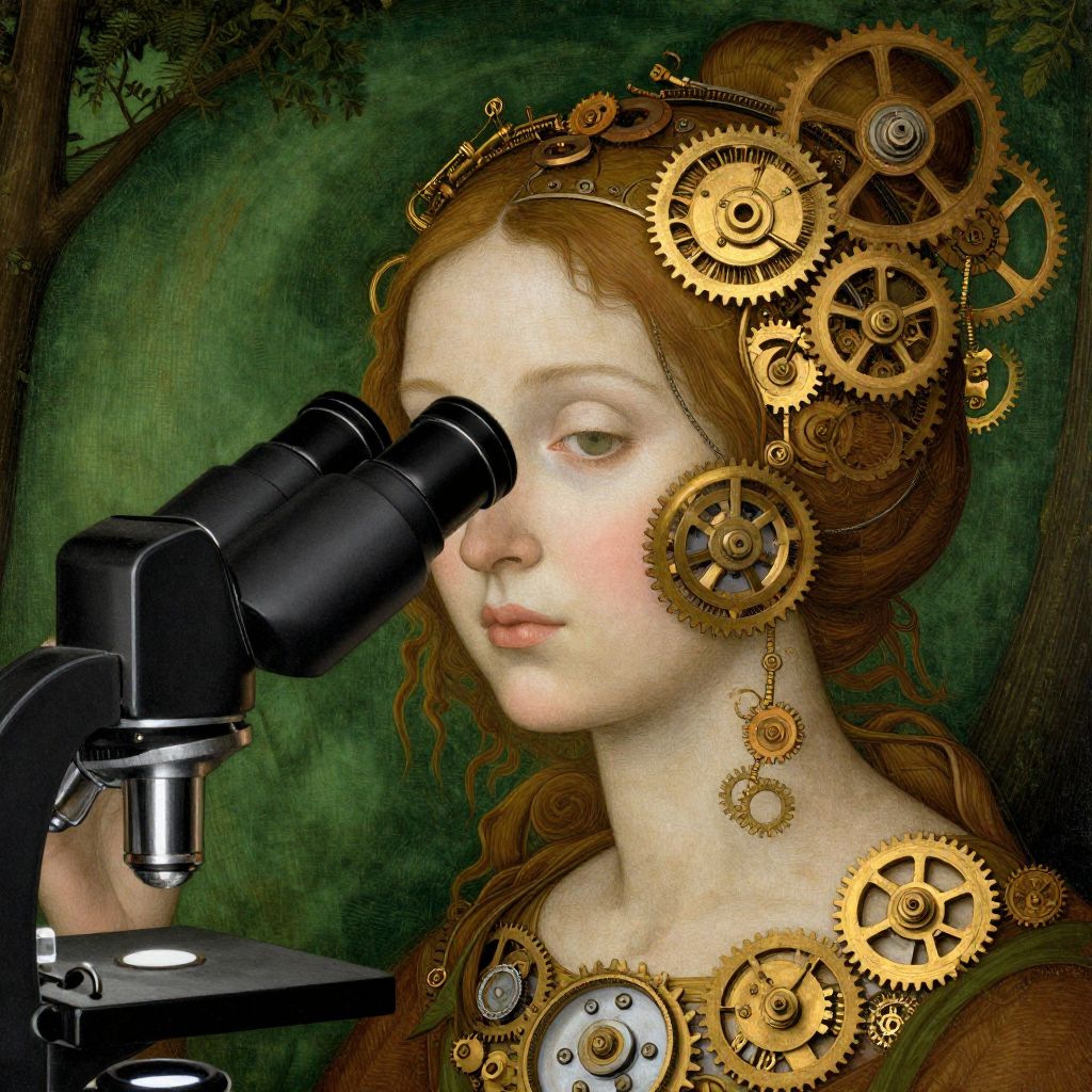 Digital artwork of a pale-skinned woman with brown, wavy hair, adorned with intricate brass gears and cogs on her head and neck. She gazes through black binoculars on the left. The background is a textured, dark green forest. The woman's expression is calm and focused. Her attire blends with the gears, creating a steampunk aesthetic. The image combines elements of realism and fantasy, with detailed textures and a blend of natural and mechanical themes.