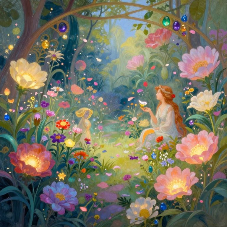 A mesmerizing digital artwork inspired by Art Nouveau aesthetics, this piece depicts an alluring garden vista from an unconventional angle, akin to a 'bug's-eye view'. This unique perspective unveils a magical landscape teeming with luminescent blooms and fantastical beings cohabiting in peaceful synergy. The vibrant color spectrum encompasses opulent gem tones and soft pastels, conjuring an aura of awe and calm as they intertwine within the lush verdure. A subtle gust stirs the petals, generating an emotional spectrum that harmoniously blends serenity with inquisitive enthusiasm.