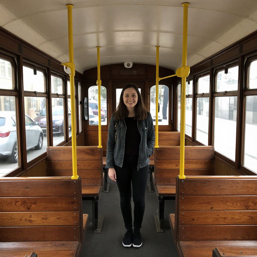 Smiling woman stands inside a vintage tramcar, surrounded by wooden benches and tall vertical poles, with a row of windows revealing parked cars outside.