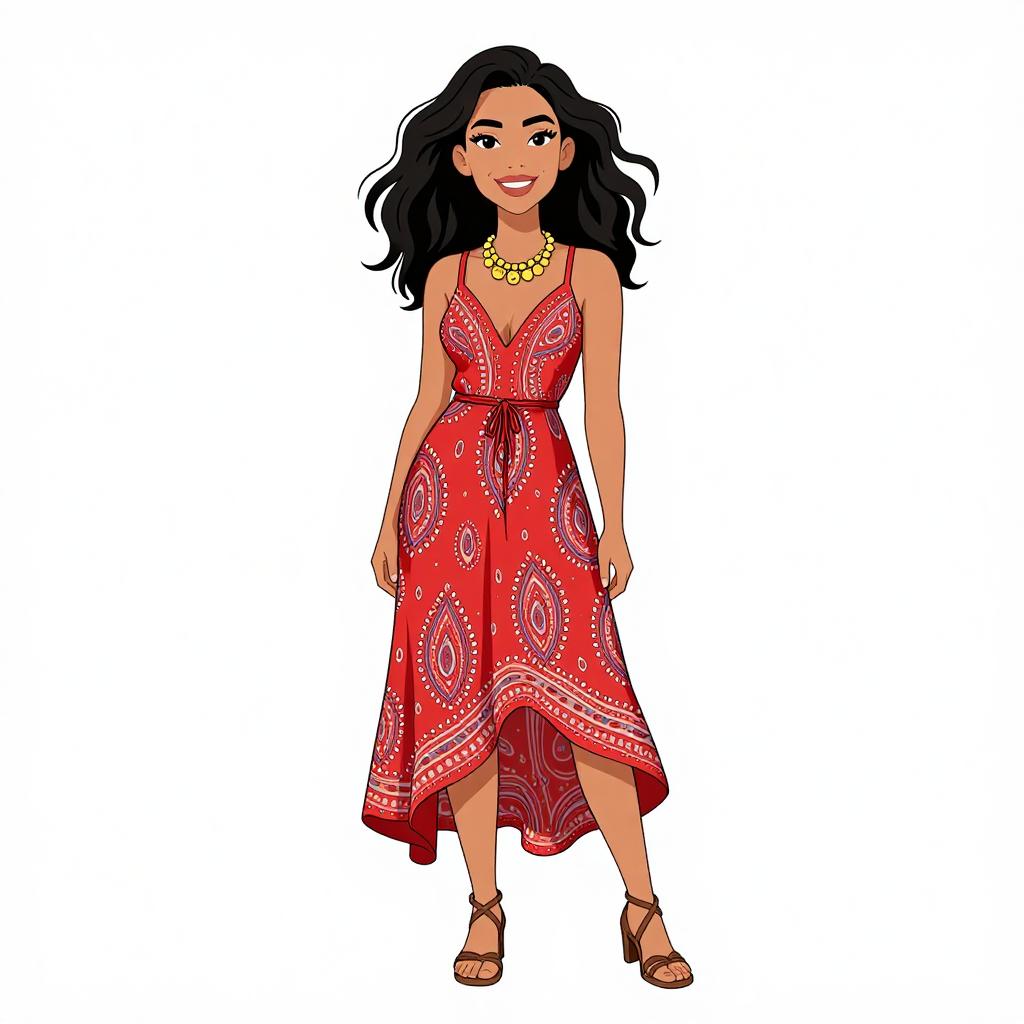 Digital illustration of a smiling woman with long black hair, wearing a red, patterned, sleeveless dress, yellow necklace, and brown sandals. White