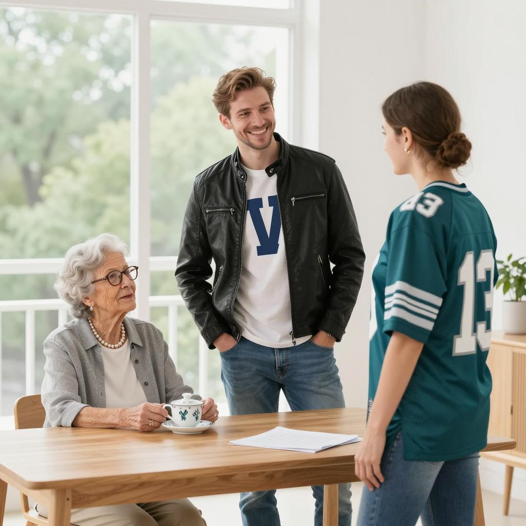 Photograph of three people in a bright room with large windows. Elderly woman with gray hair and glasses sits at a table, holding a cup. Young man in black leather jacket, white T-shirt with large blue lettering, and blue jeans stands smiling. Young woman with brown hair in a bun wears a teal football jersey, standing facing the man. Table has tea set and papers. Light wooden furniture. Green trees outside.