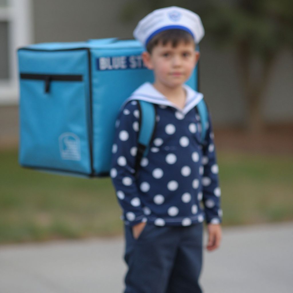Blue streak pizza delivery, 1boy, male focus, solo, hat, looking at viewer, pants, long sleeves, standing, shirt, sailor hat, closed mouth, blurry, polka dot