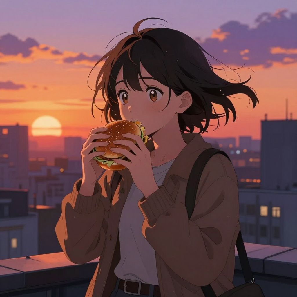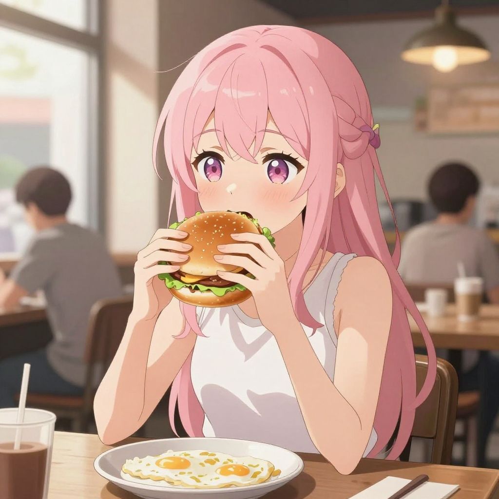 Anime Girl Enjoying Cozy Cafe Burger