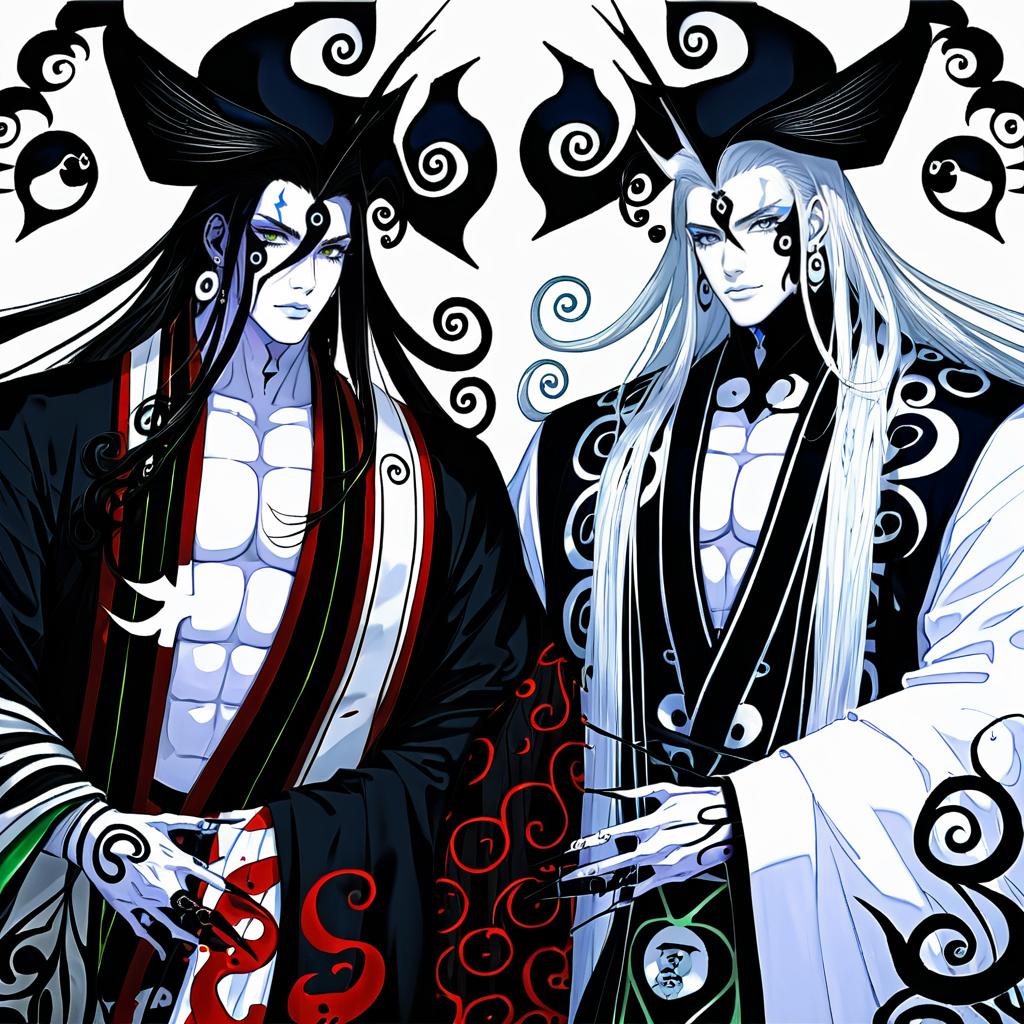 Ashiya douman (third ascension) (fate), fate/grand order, 1boy, black skin, black eyes, hair between eyes, two-tone hair, white hair, black hair, very long hair, asymmetrical hair, curly hair, split-color hair, hair intakes, traditional clothes, black headwear, traditional clothes, very long fingernails, sharp fingernails, black nails, magatama earrings, onmyouji, toned male, pectorals, shikigami, onmyouji, tate eboshi, by artist hashi, anime