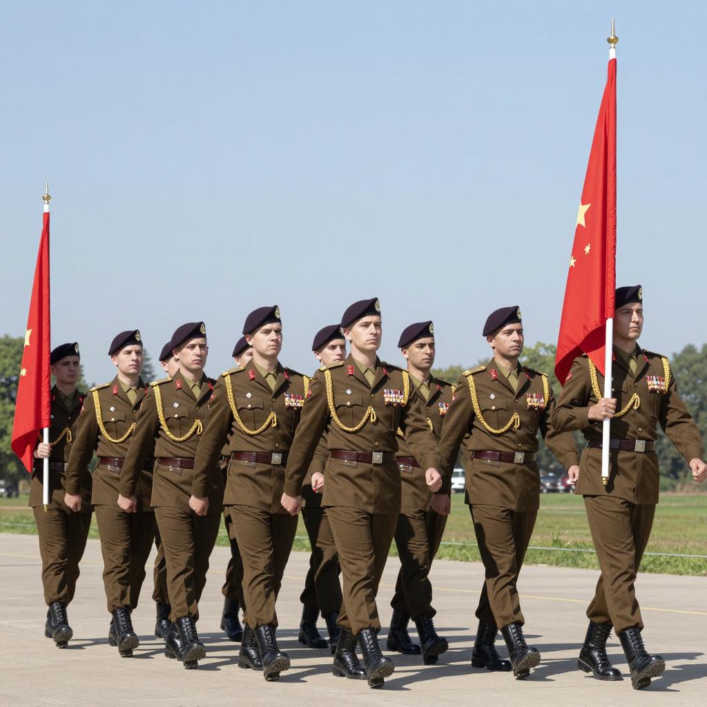 Group of uniformed soldiers marching in formation outdoors. 15 men in brown military uniforms with dark berets, medals, and badges. Front row: 5 men with serious expressions. One soldier on the right wearing a hat and holding a flag. Clear blue sky, green field, and trees in the background. Soldier on the left holds a red flag. soldiers in formation, marching, uniforms, berets, medals, outdoors, flag, clear sky, green field, trees