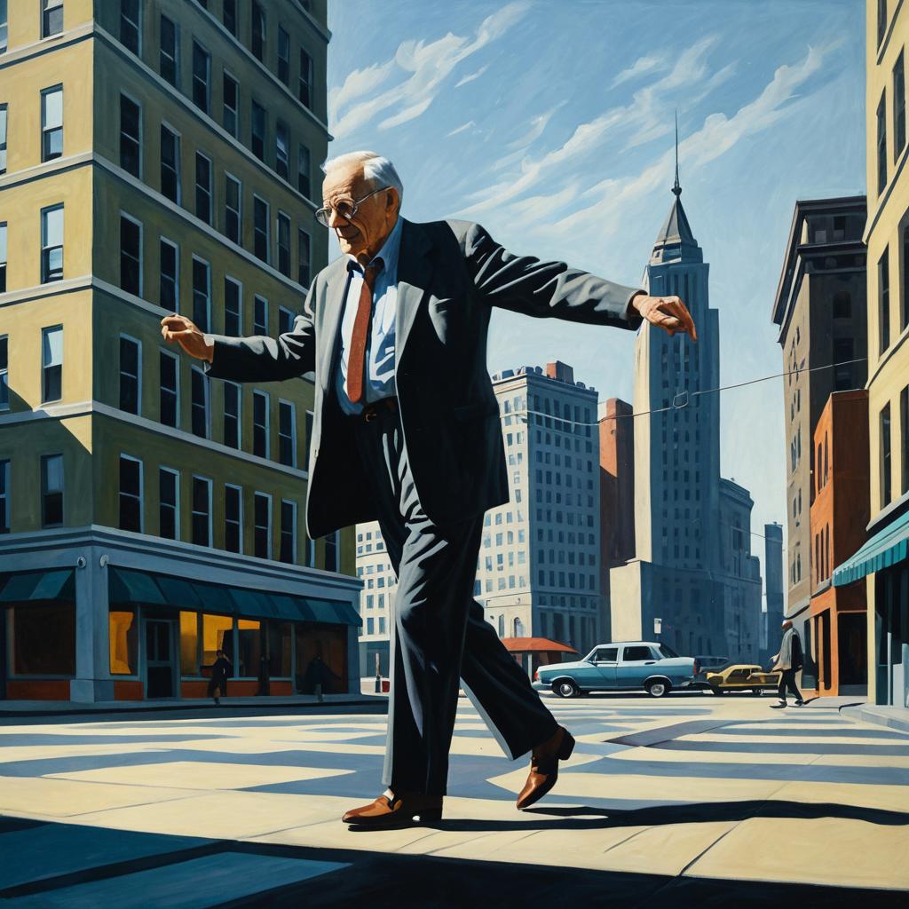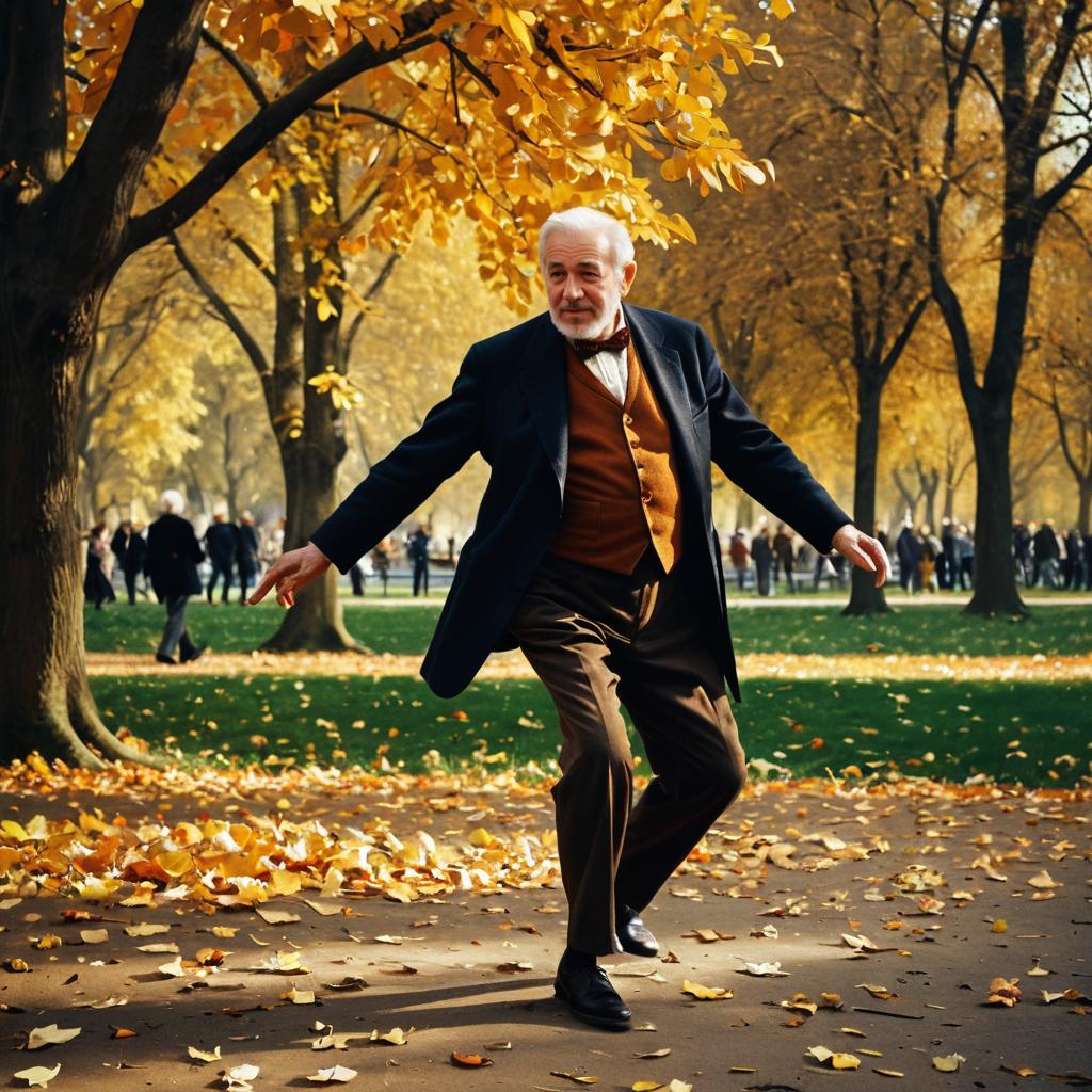 An elderly man dancing by the river, oil painting in the style of Edgar Degas, Use celtic swirls in rich deep colors to create a hypnotic background.