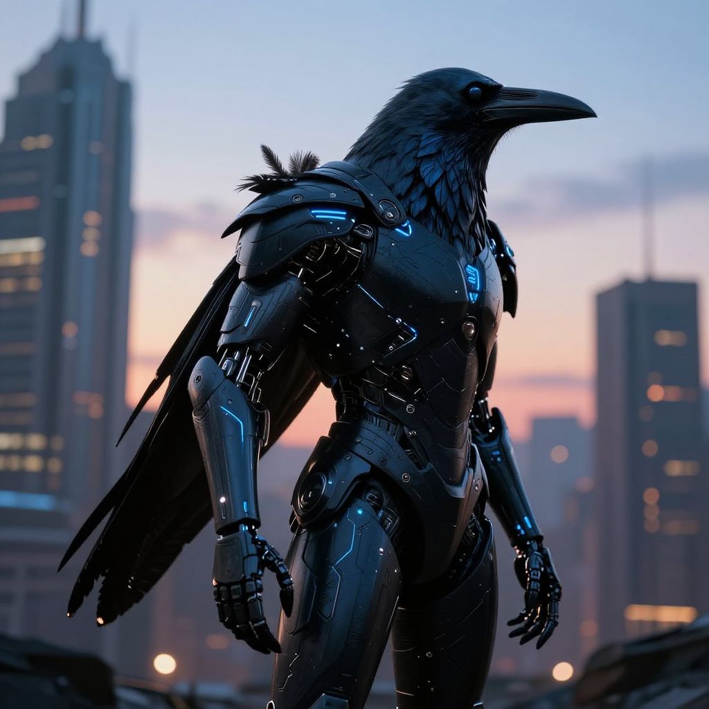 Digital artwork of a cybernetic crow humanoid with metallic armor, standing in a cityscape at dusk, glowing blue lights accentuating its dark feathers and