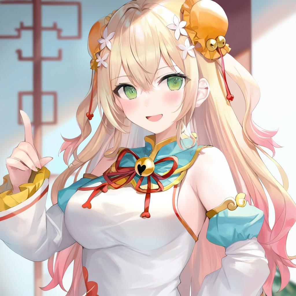 Momosuzu nene (old design), hololive, 1girl, fang, green eyes, hair between eyes, blonde hair, long hair, gradient hair, pink hair, double bun, two side up, hair flower, bun cover, medium breasts, large breasts, chinese clothes, chinese clothes, detached sleeves, juliet sleeves, virtual youtuber, virtual youtuber, jingle bell, by artist momoko (momopoco), leet