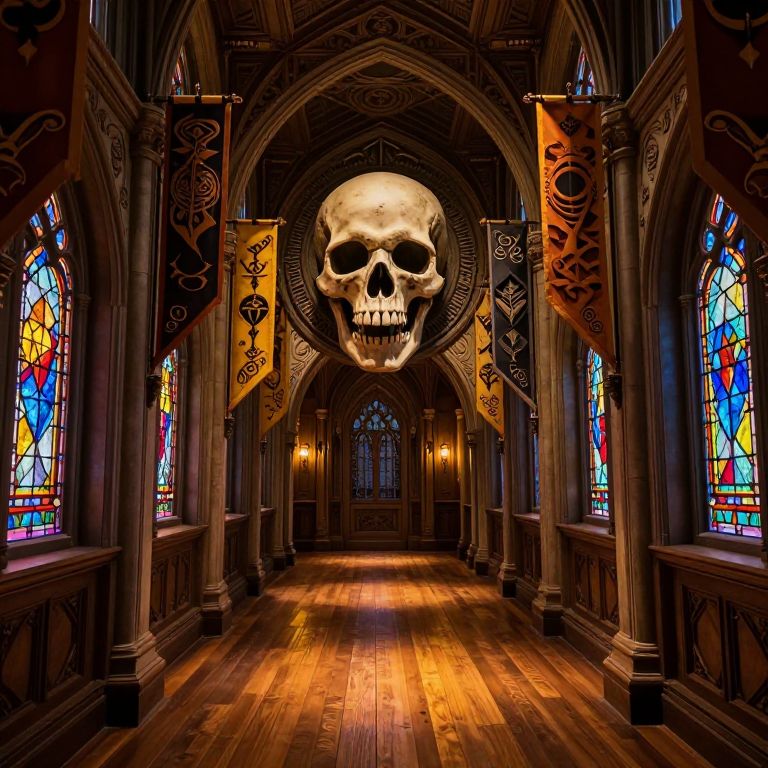 The image depicts a futuristic corridor with a gothic aesthetic, featuring intricate designs and a skull motif. The corridor is illuminated by warm, ambient lighting that casts a soft glow on the polished wooden floor. The walls are adorned with ornate banners and stained glass windows, adding to the gothic ambiance. The central focus is a large, detailed skull emblem, flanked by symmetrical banners and intricate carvings. The overall composition is balanced, with elements arranged in a harmonious manner, creating a sense of depth and perspective. The interplay of colors, textures, and shapes contributes to a visually rich and immersive experience.