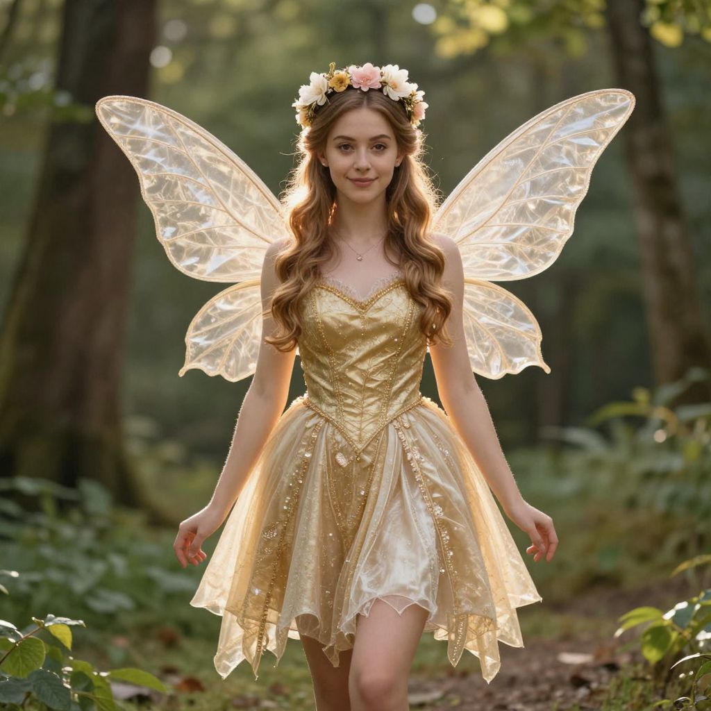 Photograph of a young woman with long, wavy brown hair, wearing a golden, strapless, fairy-like dress with delicate, semi-transparent wings. She has a flower crown on her head and stands in a sunlit, forested area with green foliage. Her wings are illuminated, creating a glowing effect. She has a fair skin tone and a gentle smile. The background features tall trees and soft, natural light, enhancing the ethereal, fairy-tale aesthetic of the scene. The image captures a magical, whimsical atmosphere.