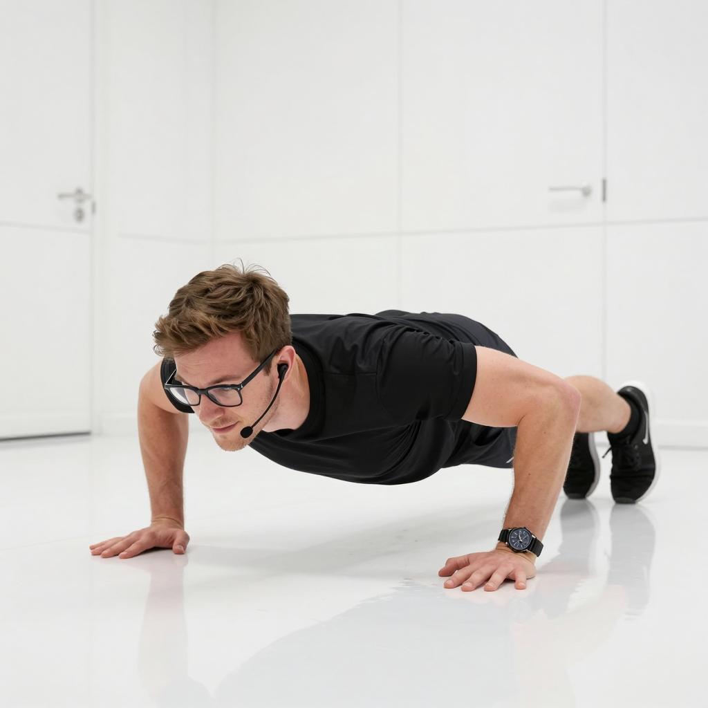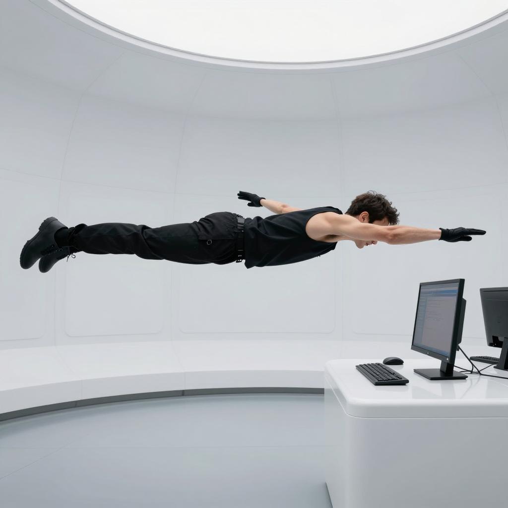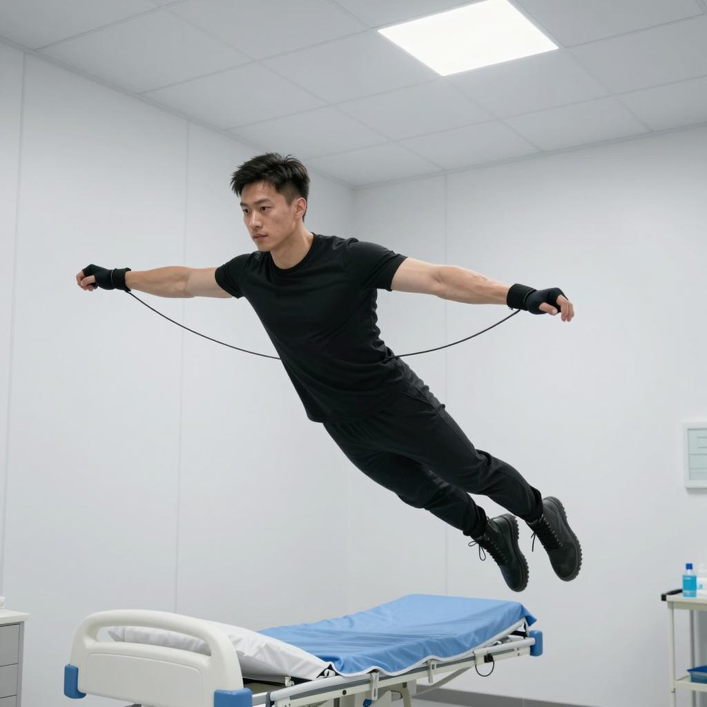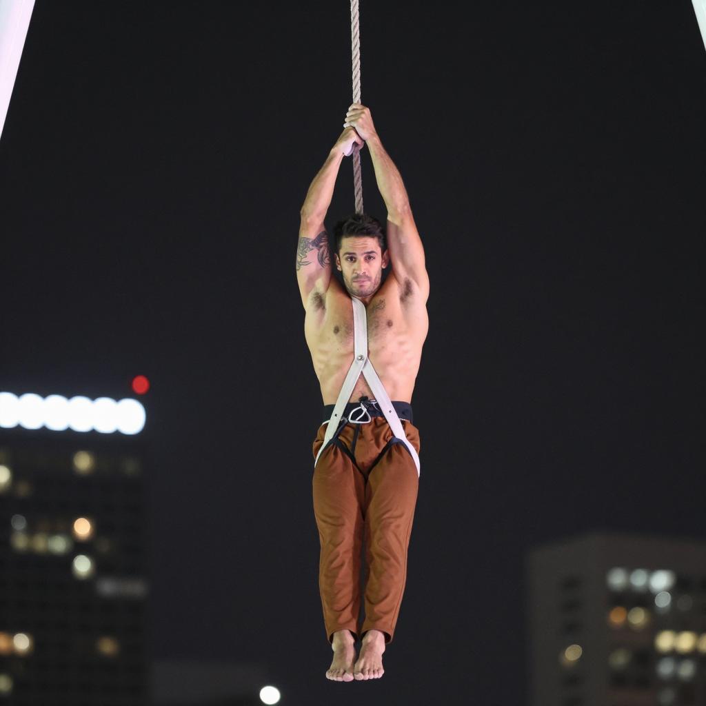 Man with glasses, dark hair, and mustache hangs upside down from ceiling with harness, wearing black pants and orange shirt. Another man with bald head, black shirt, and gray pants also hangs upside down. White ceiling with rectangular lights and vents in background. Lower man's face shows intense expression. Overhead perspective.