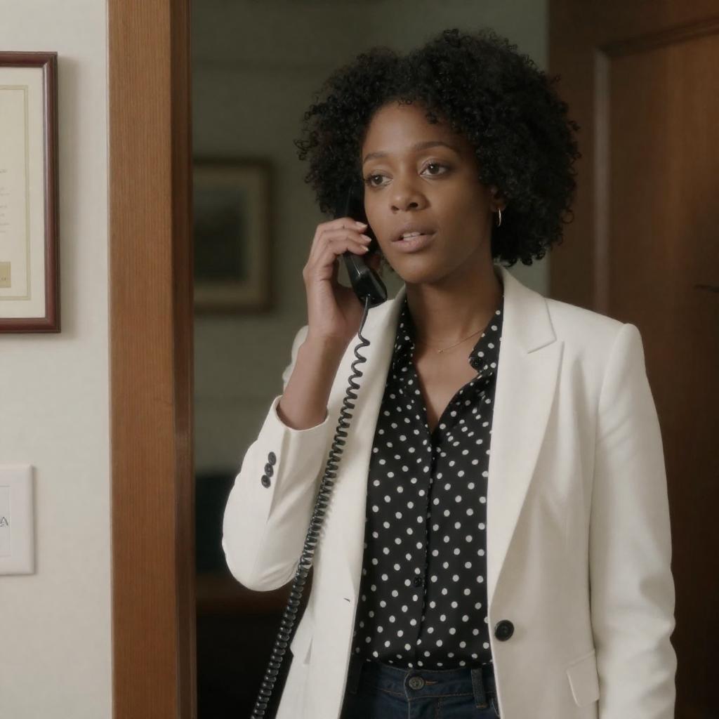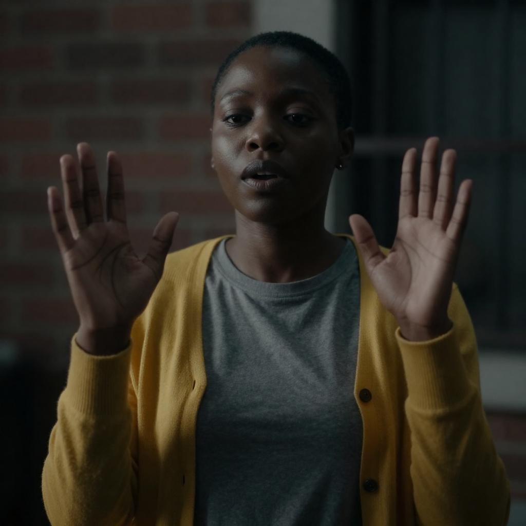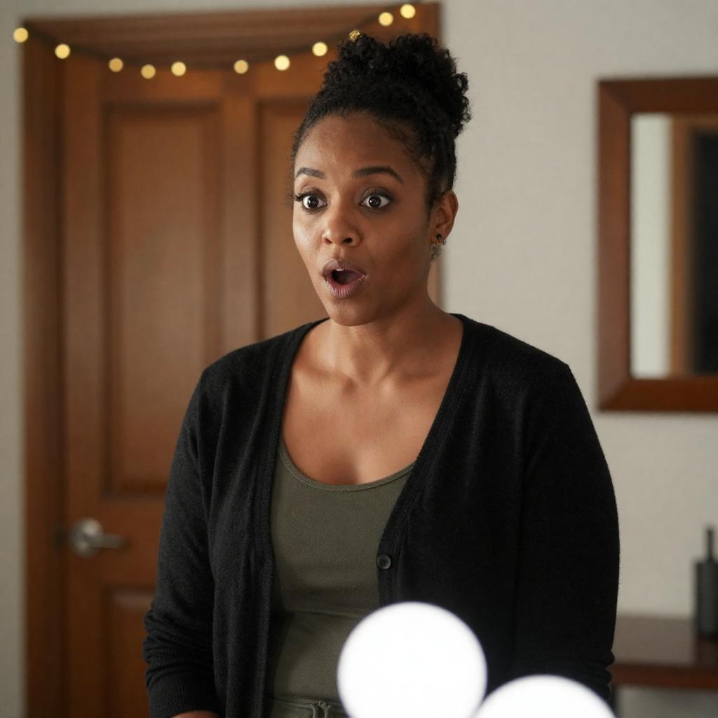 Photograph of a Black woman with short, curly black hair, wearing a black top, looking surprised with wide eyes. Background includes a brightly lit lamp and a vintage TV. Blue curtains are in the background. She is the central figure, facing slightly to the right.