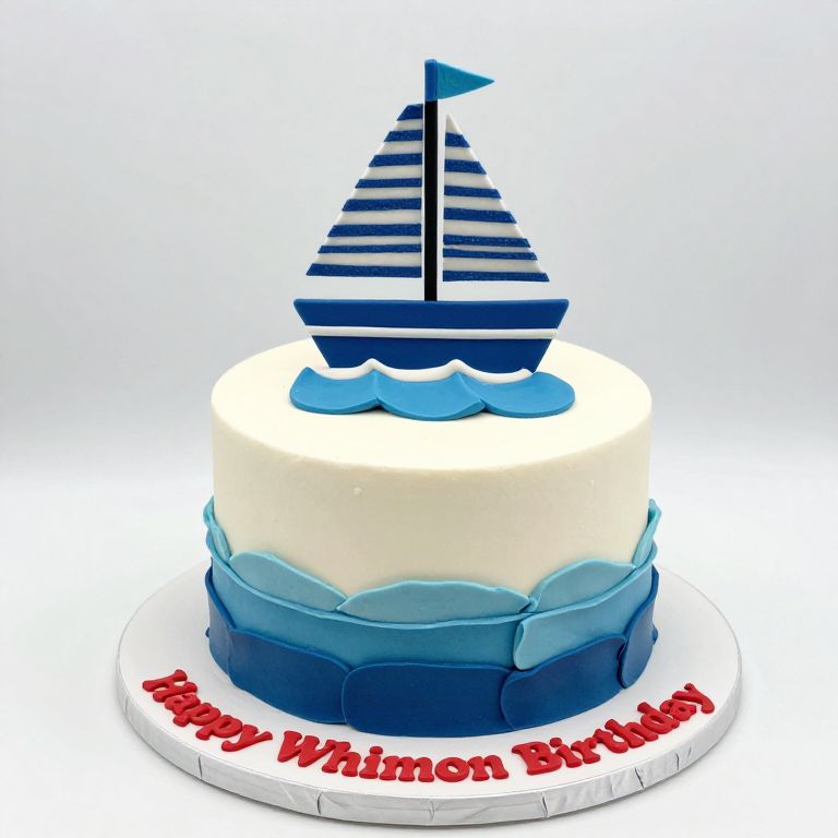 Nautical-themed birthday cake featuring a smooth white top adorned with a detailed sailboat decoration, blue fondant waves, and layered ruffles in varying shades of blue, set atop a circular base inscribed with \"Happy Whimon Birthday\" in bold red letters.