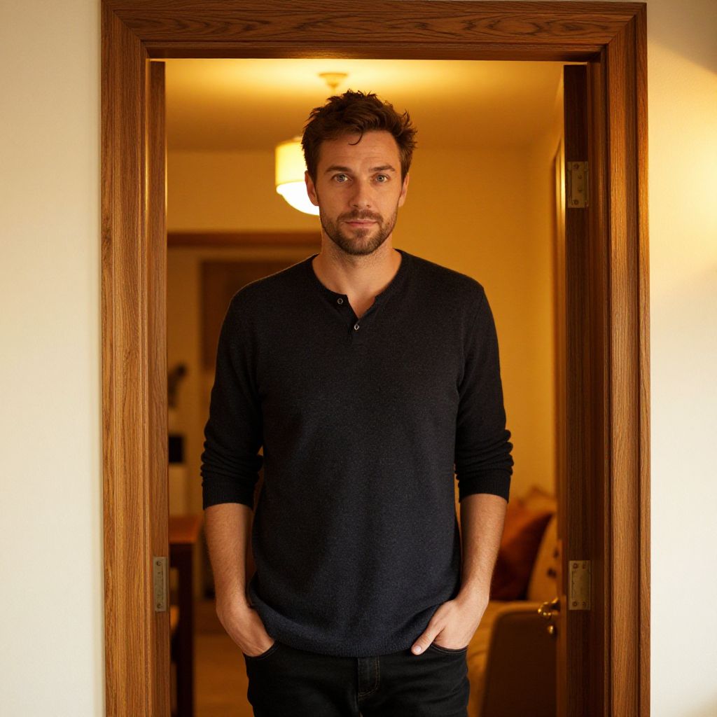 Photograph of a handsome Caucasian man with light skin, short brown hair, and a trimmed beard, standing in a wooden-framed doorway. He wears a black, long-sleeve, henley shirt with hands in his pockets, looking directly at the camera with a neutral expression. The background is an warmly lit, blurred indoor space with yellowish lighting, featuring a visible ceiling light and a hint of a couch. The image has a shallow depth of field, focusing on the man while the background is softly out of focus.