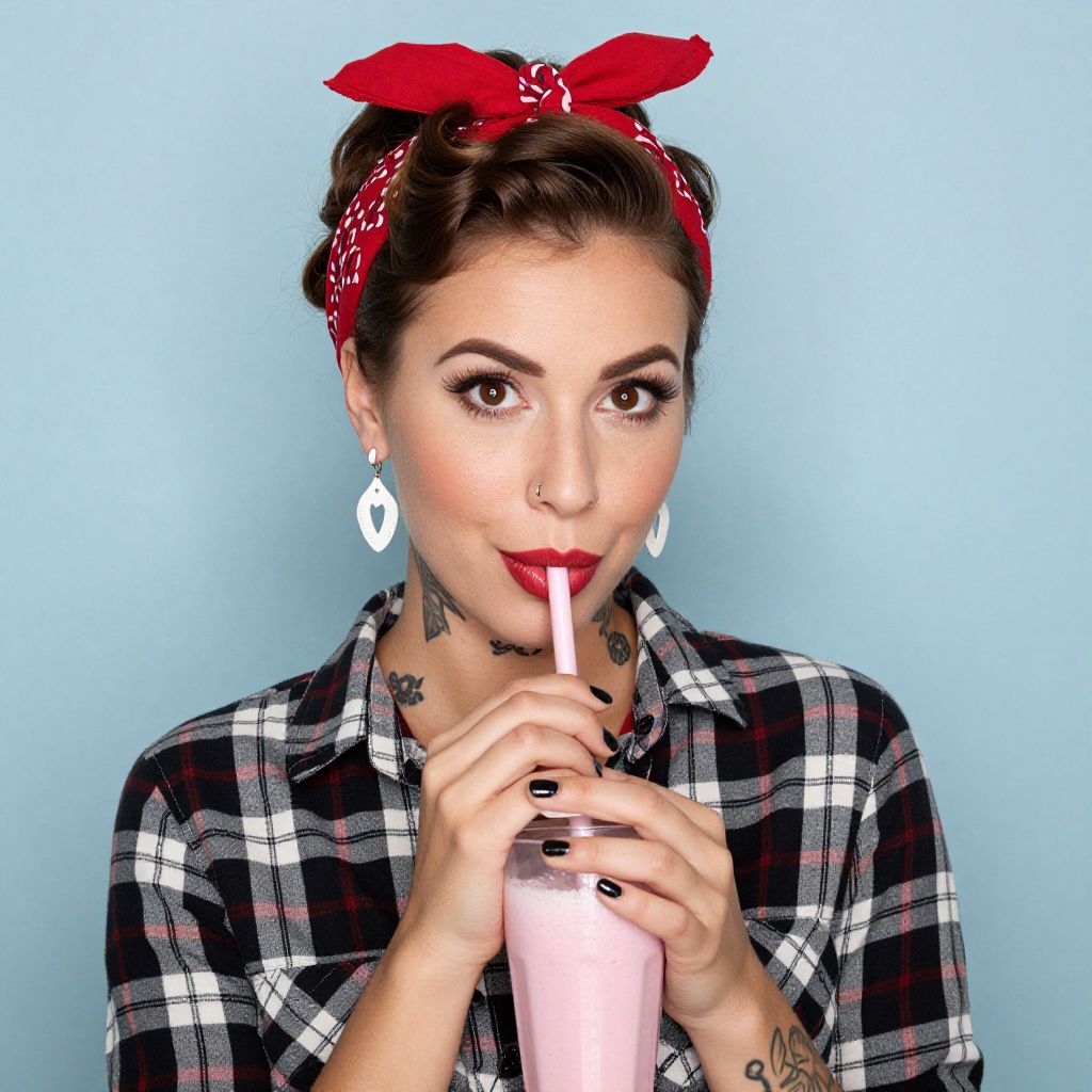 A photograph of a woman with fair skin and brown hair styled in a retro updo, wearing a red bandana and white earrings. She has black nail polish, a nose ring, and visible tattoos on her neck. She's dressed in a black, white, and red plaid shirt, holding a pink milkshake with a straw. The background is a plain, light blue wall.
