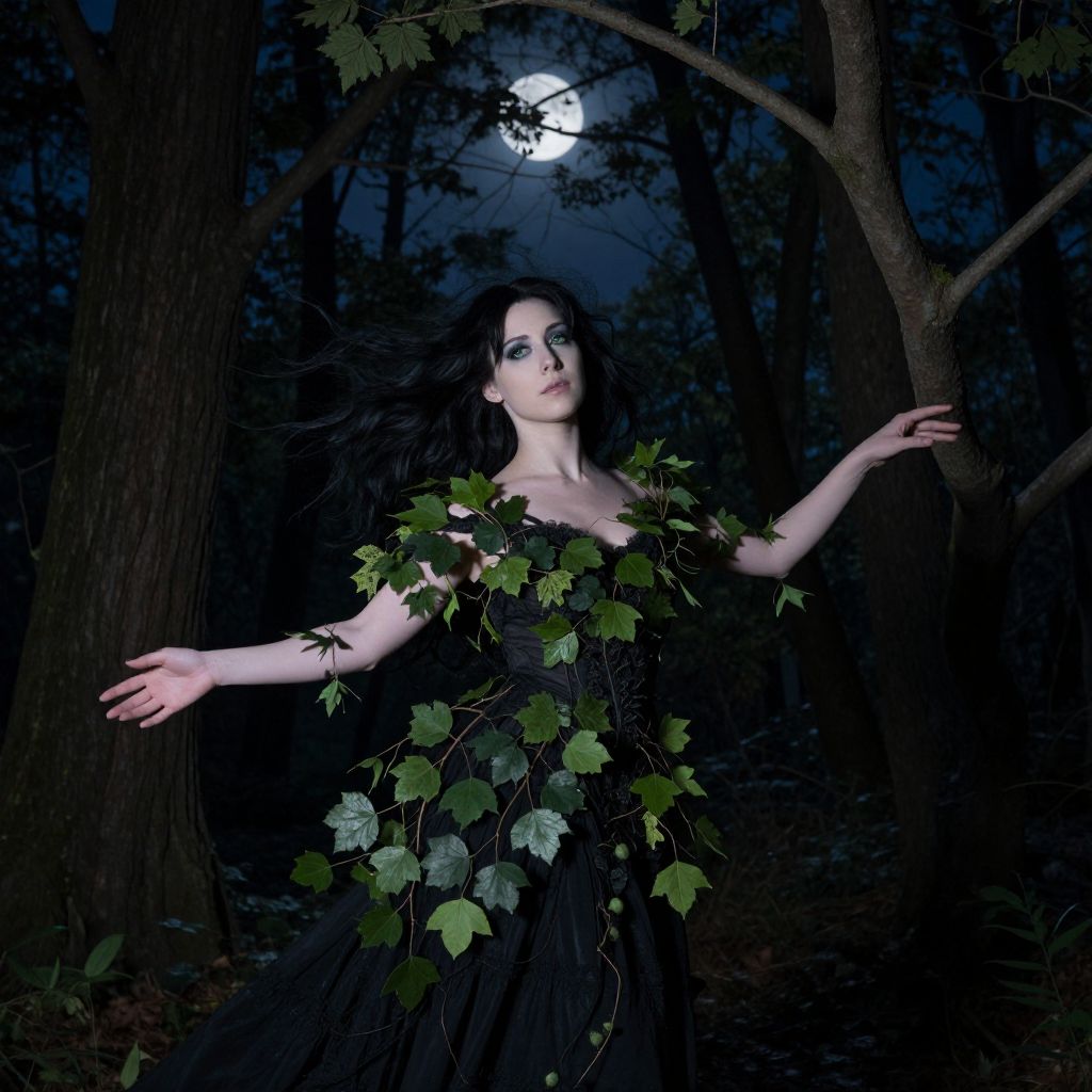 Photograph of a pale woman with dark hair, wearing a black dress adorned with green leaves, standing in a moonlit forest, arms gracefully outst