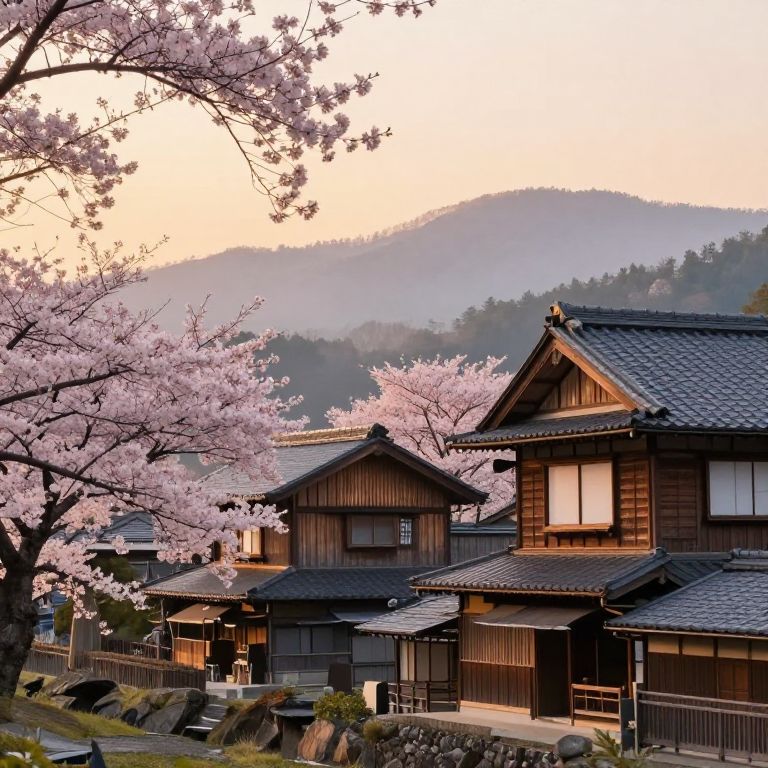 Japonais traditional village at sunset, wooden houses with sliding doors, cherry blossom trees in full bloom, misty mountain background, soft warm lighting, delicate brush stroke style, tranquil and nostalgic atmosphere