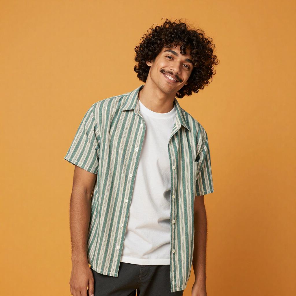 Photograph of a young man with curly dark hair and a slight mustache, smiling confidently. He's wearing a white t-shirt under a green and white striped short-sleeve shirt, with dark pants. The bright orange background contrasts with his outfit, making him stand out. He's slightly leaning to his right, with his left arm relaxed by his side. The image has a casual, playful vibe.