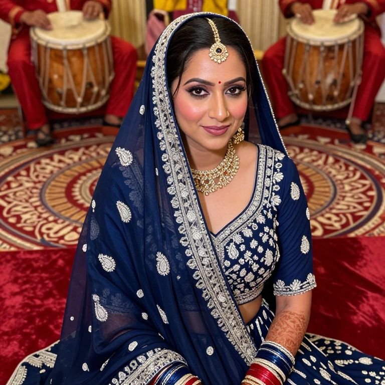 Close-up photography of a modern Indian bride wearing a designer anarkali suit with a deep navy blue base and traditional white paisley patterns, her skin glowing with a healthy tan, dark brown eyes, and a soft smile, positioned on a red velvet dais during a cultural wedding celebration in Jaipur, with intricate mandalas and traditional drummers in the background
