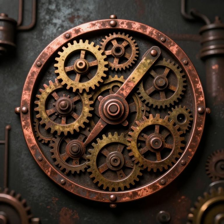 Photograph of intricate, steampunk-style gear mechanism with copper and gold gears, set against a dark, textured background with rusted metal elements.