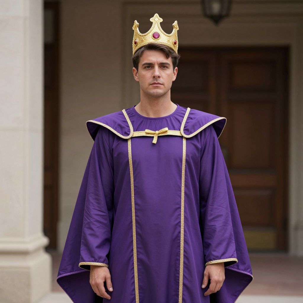 Photograph of a young man with short dark hair, wearing a gold crown and royal purple robe with gold trim, standing in front of a wooden door