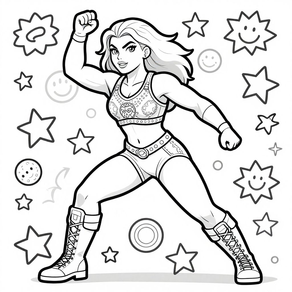 Alexa Bliss coloring pages featuring a dynamic female wrestler in an action pose, surrounded by playful patterns and bold outlines, perfect for creative coloring with varied shading styles.