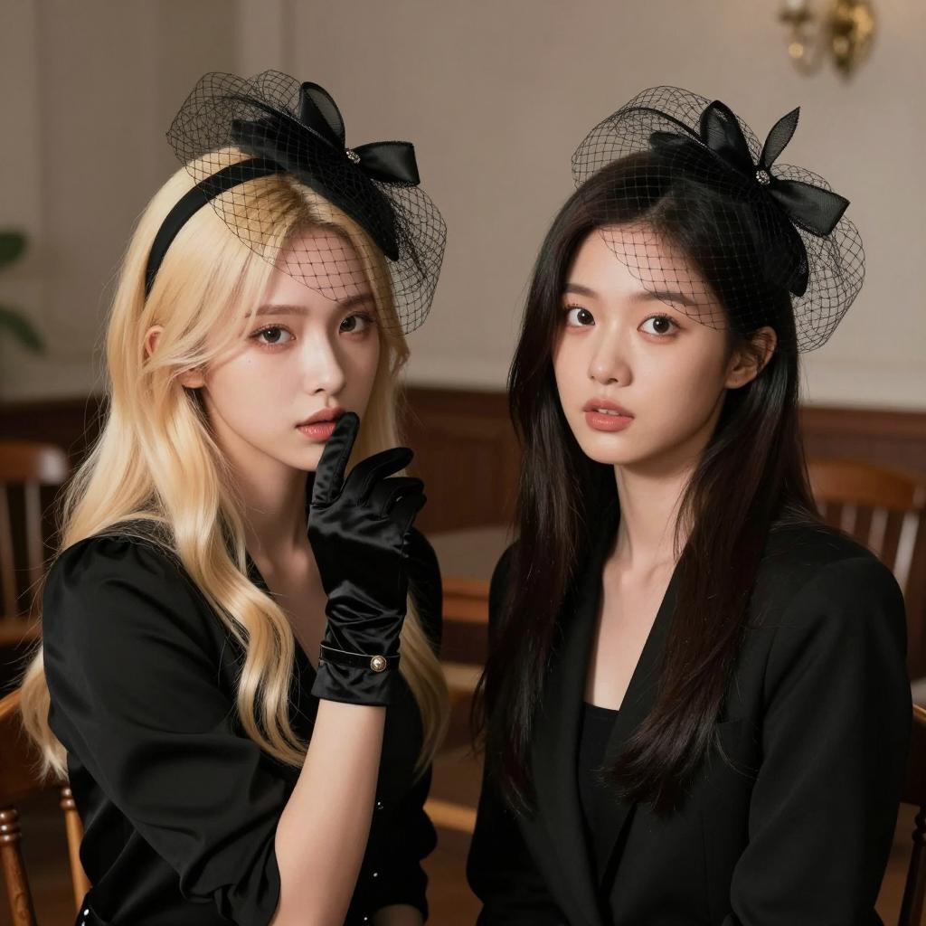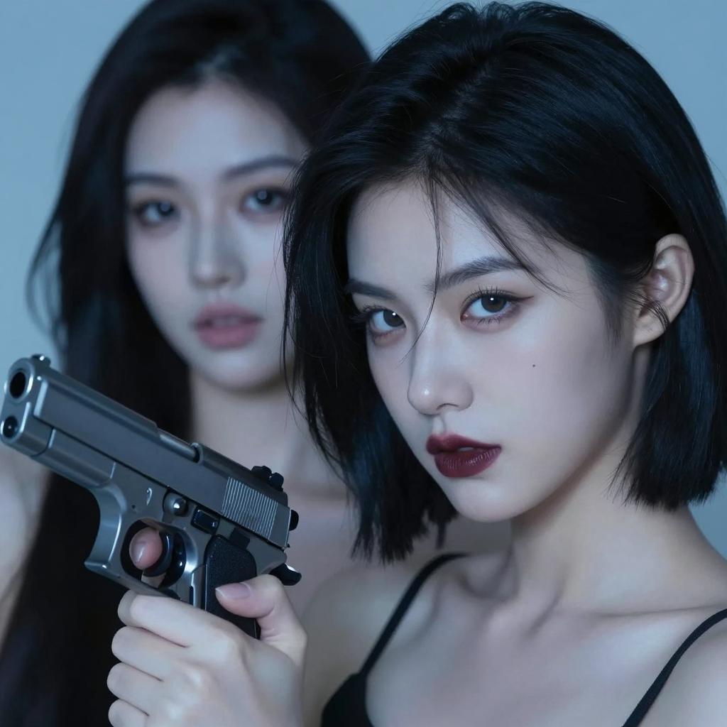 Two women with blue tint. Foreground woman with short black hair, pale skin, dark lipstick, holding a silver gun, looking to the right. Background woman with dark hair, partially obscured, blue skin, lips slightly parted, looking forward. Both women have bare shoulders, close physical proximity, intense expressions.