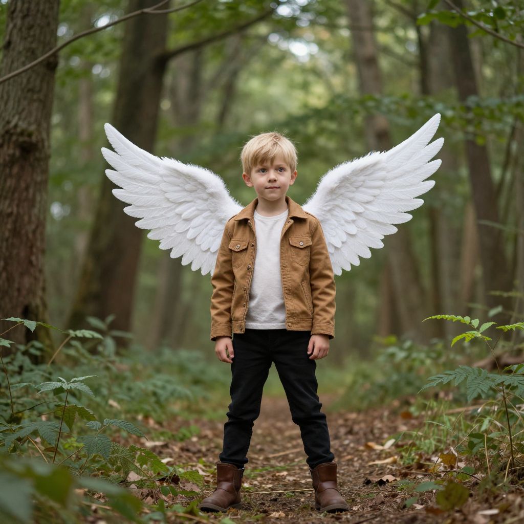 Photograph of a blonde boy with white angel wings, brown jacket, white shirt, black pants, and brown boots, standing in a forest path.