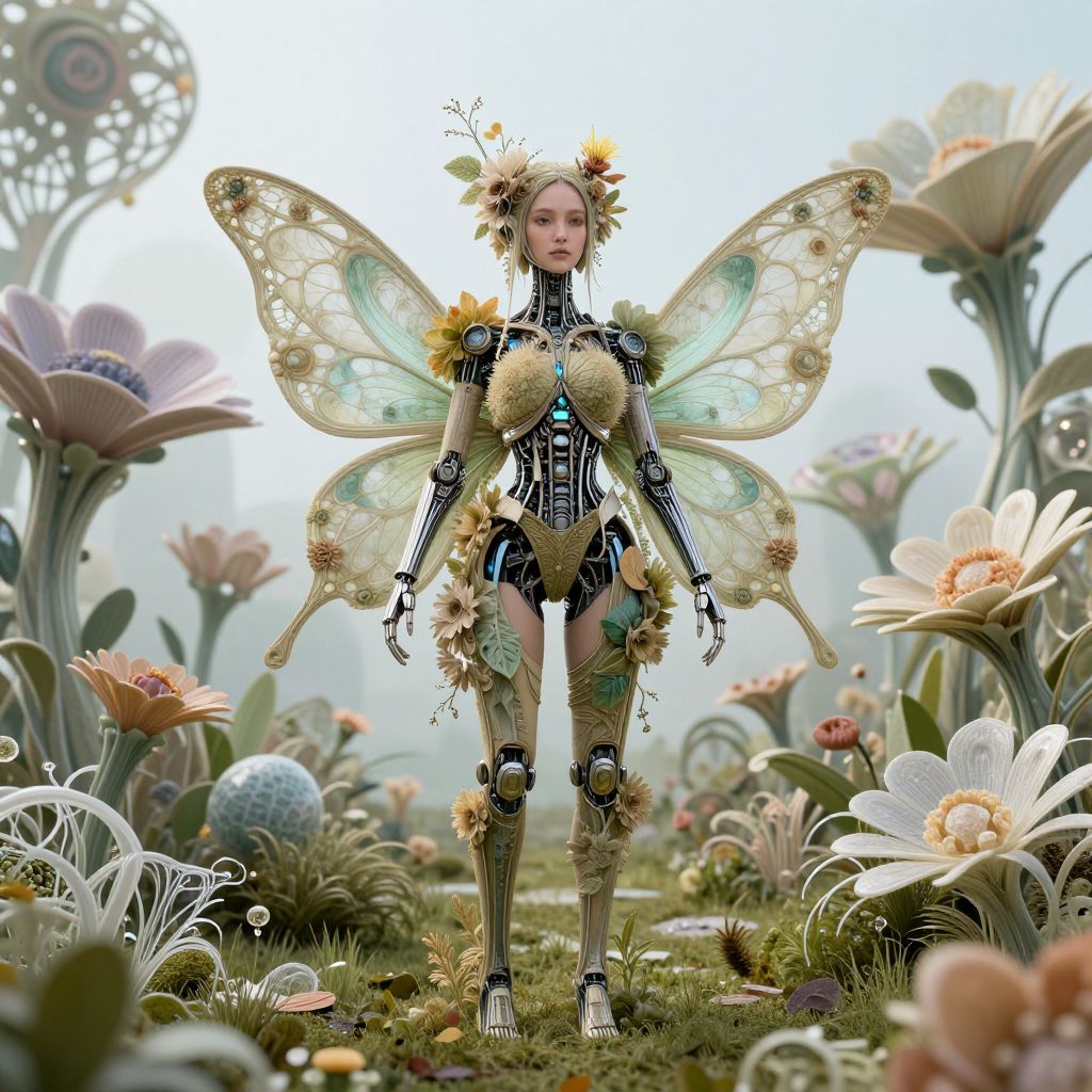 Digital art of a futuristic, humanoid fairy with translucent wings, adorned with flowers, standing in a whimsical, flower-filled garden.