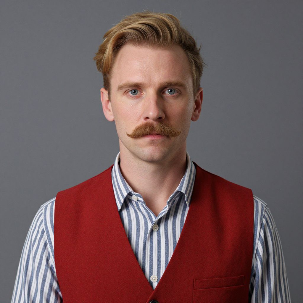 Man with blonde hair and a mustache wearing a red vest with a striped shirt underneath.