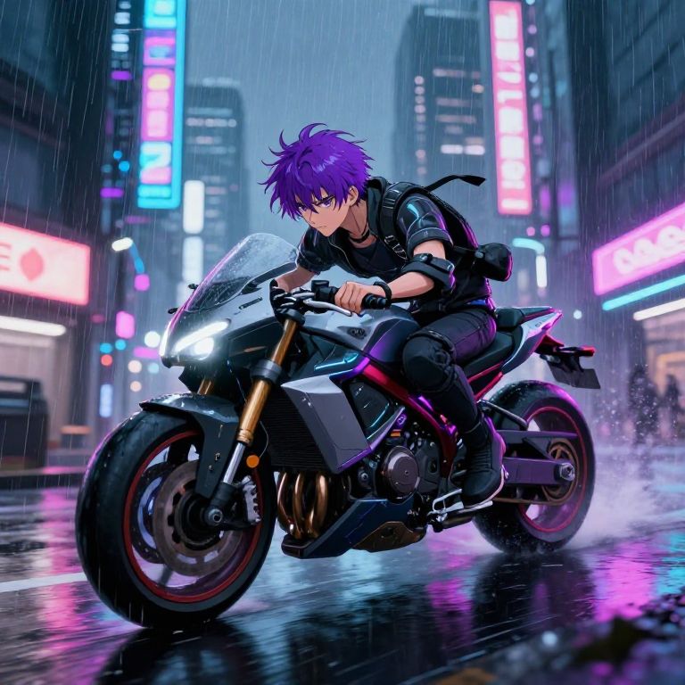 Anime boy with purple hair riding a futuristic motorcycle through a rain-soaked neon city, reflections of bright signs on wet pavement, cyberpunk vibes, intense and rebellious look, detailed urban landscape with rain effects and motion blur.