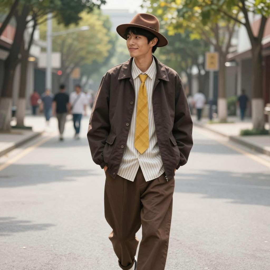 Day male costume, photo of young man standing on a street, daytime, full body, front view, wearing brown hat, striped shirt, dark brown jacket, yellow tie around waist, dark brown pants, slight smile, short dark hair, trees and buildings in background, blurred pedestrians in the distance, street lighting, summer, casual style, natural light, street fashion, urban setting
