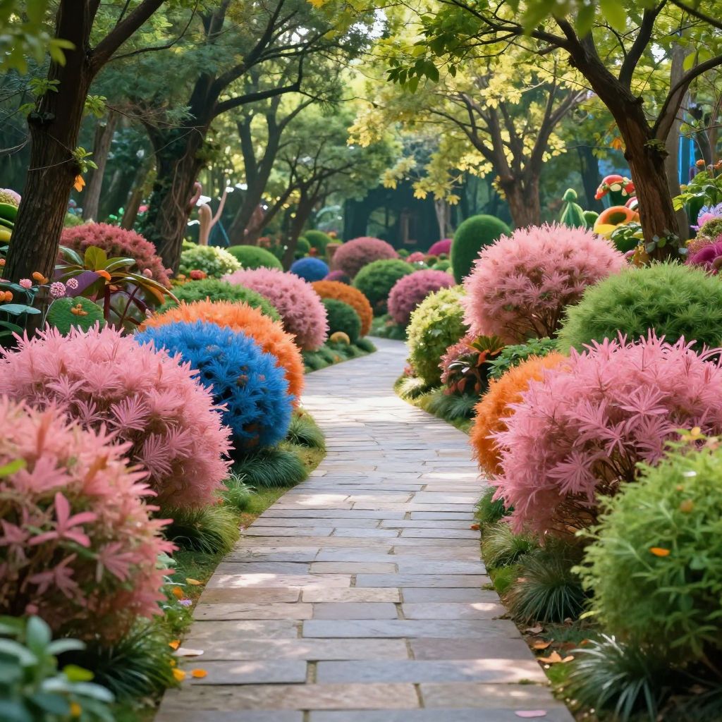 A vibrant stone pathway winds through a fantasy forest filled with uniquely shaped and colorful bushes and trees. The scene is brightly lit with soft sunlight filtering through the lush canopy, showcasing a variety of rounded, fluffy foliage in hues of pink, blue, orange, and green.