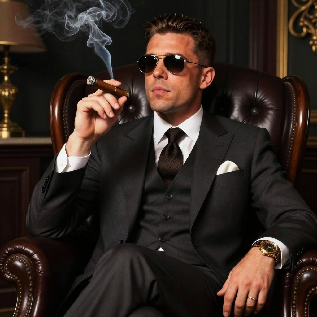 Photorealistic image of a confident man wearing a dark three-piece suit, white shirt, and tie, sitting in a brown leather armchair. He holds a lit cigar with smoke swirling upwards. The man wears dark sunglasses and a gold wristwatch, set against an elegant, dimly lit background with vintage decor.