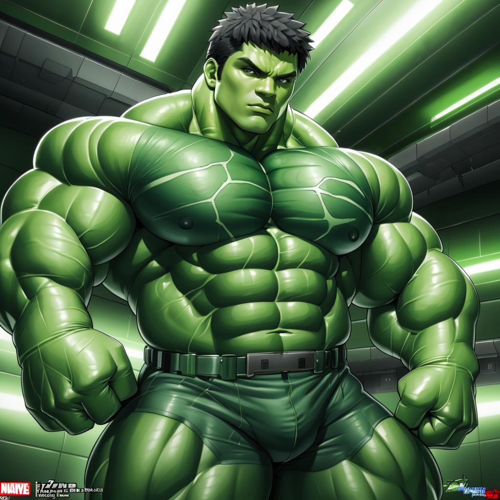 Hulk, marvel, 1boy, green skin, black hair, short hair, thick thighs, muscular male, abs, bara, large pectorals, by artist sakurai makoto (custom size), anime