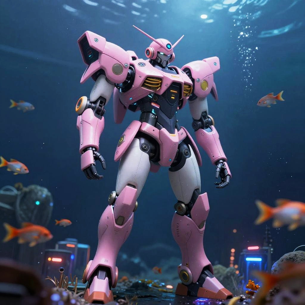 Photograph-style CGI image of a towering, pink and white humanoid robot standing in an underwater setting. The robot has a sleek, armored design with black and gold accents, and a large, angular head with a single antenna. Surrounding the robot are various colorful fish, including orange and silver ones, swimming in the dark blue water. In the background, there are illuminated, futuristic structures with blue and red lights, and submerged rocks on the ocean floor. Bubbles rise from the water's surface, adding to the underwater ambiance. The robot's stance is imposing, with legs apart and arms slightly raised.