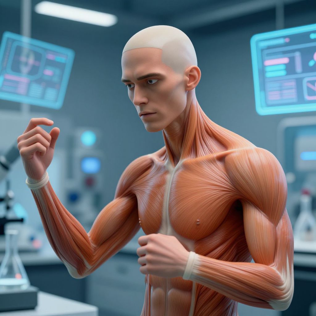 Digital CGI image of a bald, muscular male with detailed, exposed muscle anatomy in a futuristic laboratory, holding his right hand.