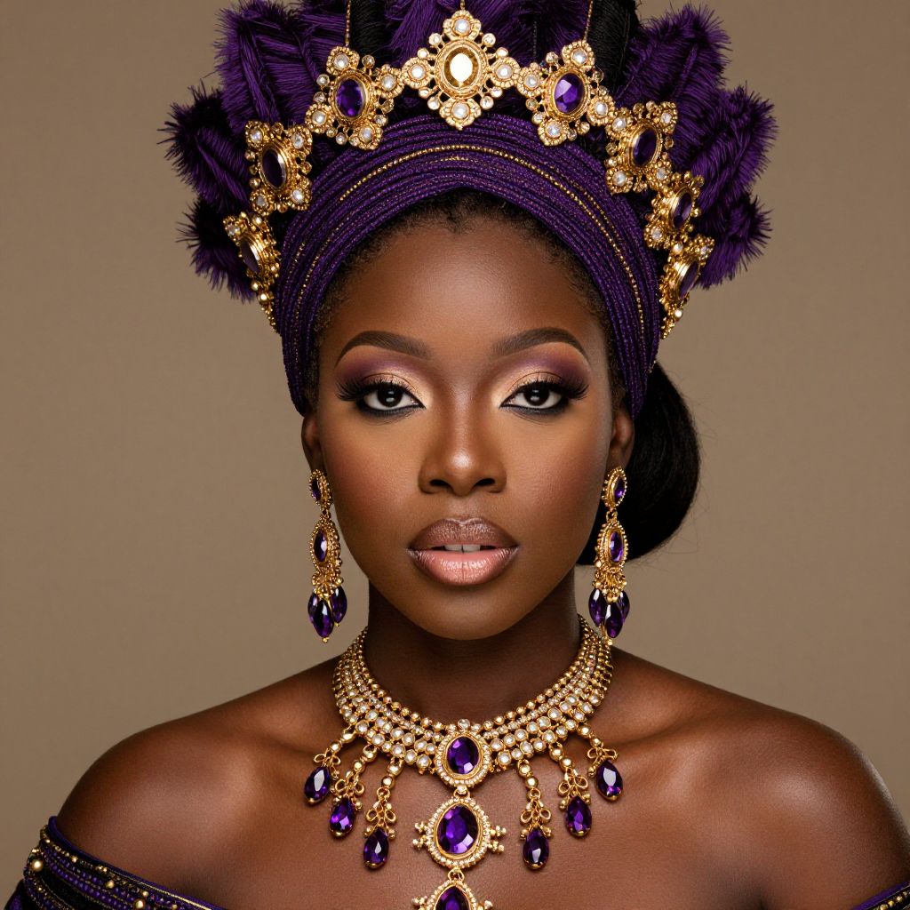 Photograph of a dark-skinned African woman with a regal, poised expression. She wears an elaborate, gold and purple headpiece adorned with feathers and intricate patterns. Her makeup is bold, with dark, smoky eyes and glossy lips. She dons a matching, off-the-shoulder black dress and wears a gold necklace with large, purple gemstones, and dangling earrings. The background is a solid, light brown color, emphasizing her striking appearance. Her hair is styled neatly under the headpiece. The image has a glamorous, high-fashion style.