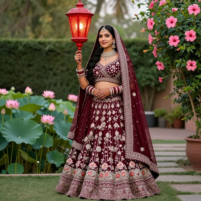 Photograph of an Indian woman standing in a lush garden. She is wearing an elaborate maroon and gold traditional lehenga choli with intricate floral embroidery, a matching dupatta, and gold jewelry including a necklace, earrings, and bangles. Her dark hair is adorned with a red bindi and a small maang tikka. She holds a red lantern in her right hand. The background features pink lotus flowers, large green leaves, and a hedge. The ground is grass with stepping stones. The image has a vibrant, colorful, and festive feel.