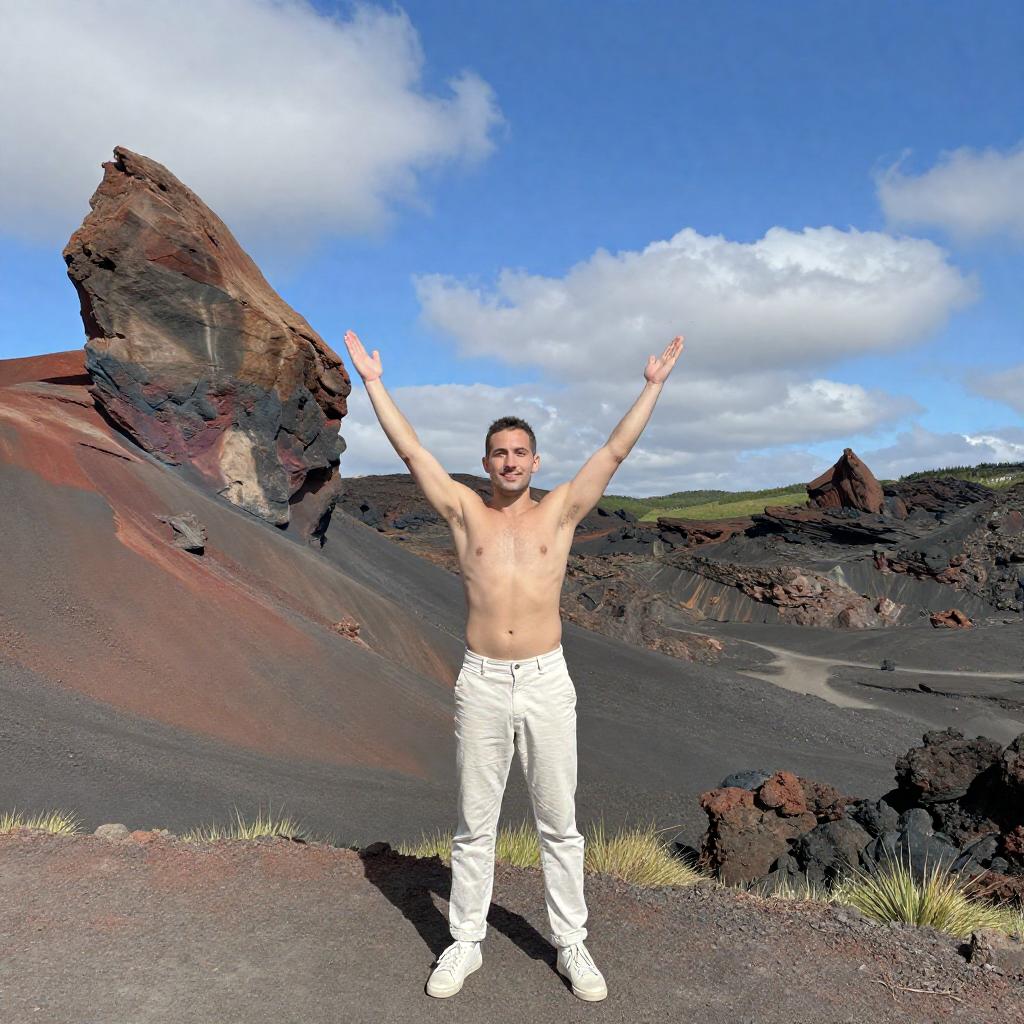 Shirtless man with light skin and short dark hair, wearing white pants and white shoes, standing on rocky terrain, arms raised above head, smiling. Large, multicolored, volcanic rock formation in background, blue sky with scattered clouds, distant green hills. Daytime, outdoors. Man centered, rock formation to left, grass in foreground.