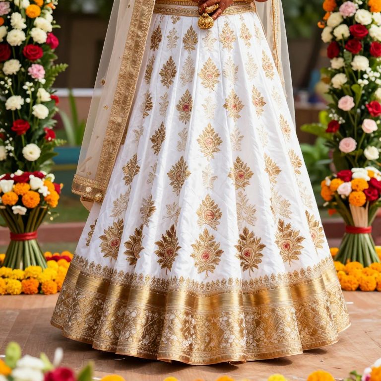 Photograph of an ornate white and gold traditional Indian lehenga with floral embroidery, surrounded by vibrant marigold garlands and flower arrangements.