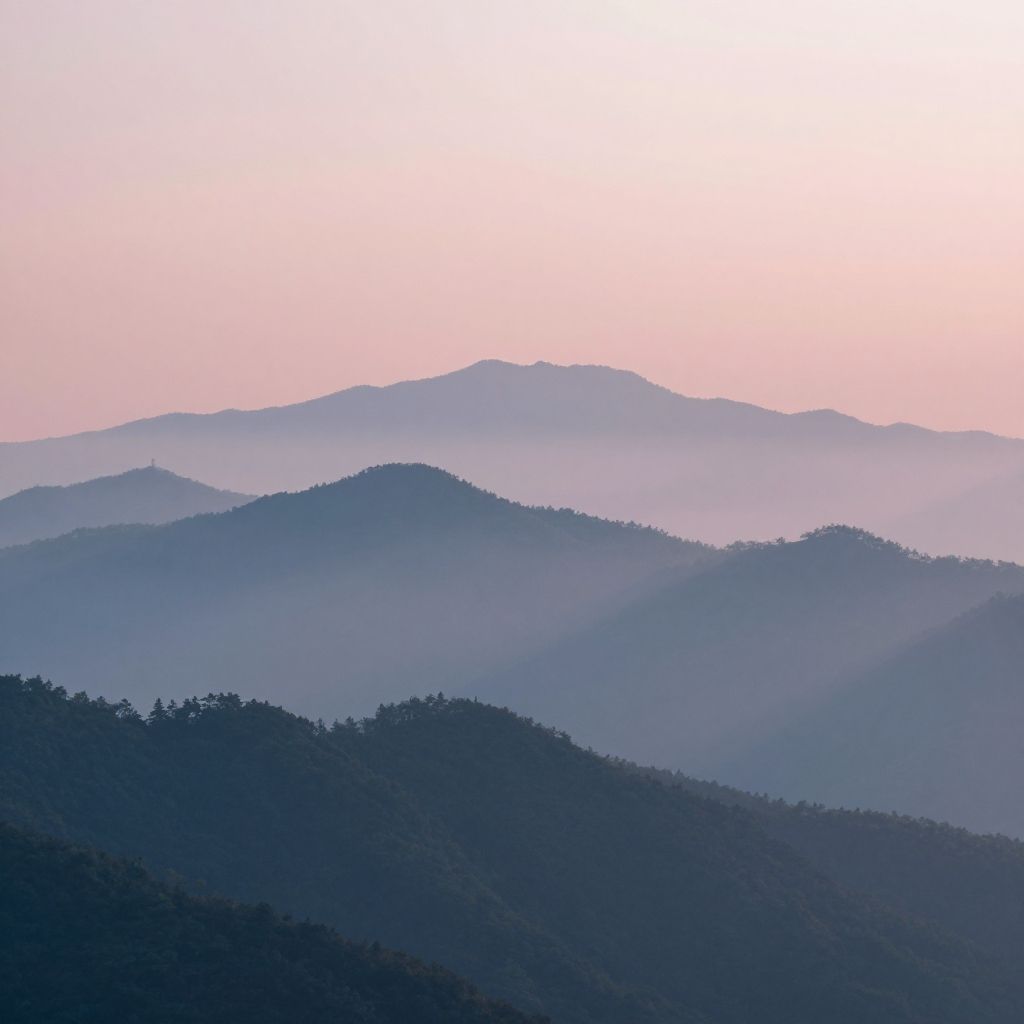 Photograph of a serene mountain landscape at dawn. The image features multiple layers of misty, blue-tinted mountain ranges, each progressively fading into the distance. The foreground shows dark, forested hills, while the background reveals lighter, more ethereal mountain peaks. The sky above is a soft gradient of pink and white, indicating early morning light. The overall composition creates a sense of depth and tranquility, with the mist adding a dreamy, almost mystical quality to the scene. The photo emphasizes natural beauty and calmness.