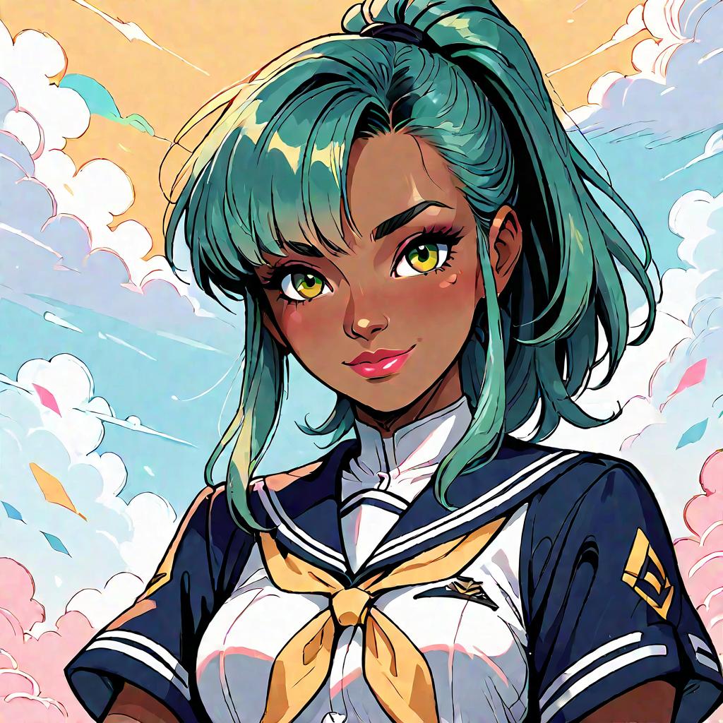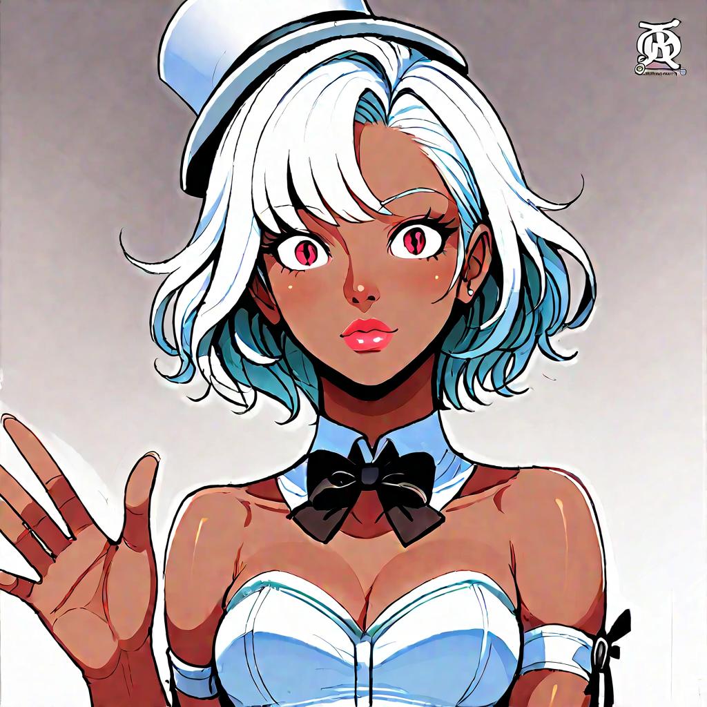 Score_9, source_anime, waving, upper body, skindentation, bow tie, top hat, bare shoulders, bare arms, arm strap, dark skin, red eyes, slit eyes, xqqqqt 1girl, standing, looking at viewer, solo, expressionless