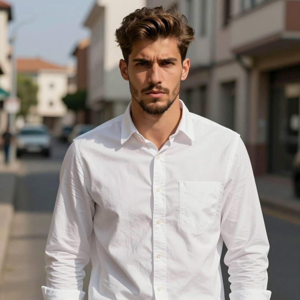 A confident man dressed in a casual denim shirt poses at a bustling summer festival illuminated by warm string lights and paper lanterns. The photorealistic portrait captures the relaxed yet stylish vibe of the event with the softly blurred crowd in the background.