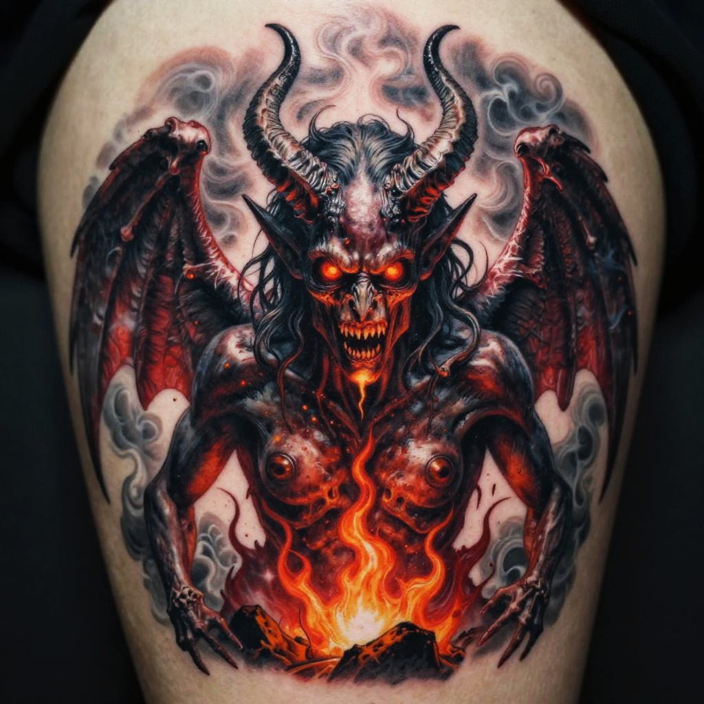 Realistic horror tattoos illustrating demonic figures with fiery eyes, skeletal wings, and menacing horns, set amidst swirling dark smoke and red embers, with lifelike skin detail and dynamic lighting for maximum impact.